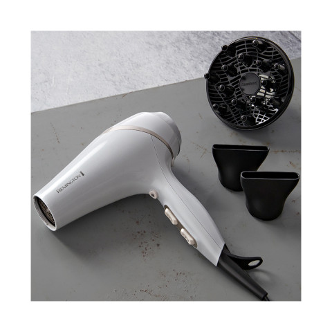 Фен Remington AC8901 оснащен технологией кондиционирования Moisture Lock, которая помогает сохранить идеальный баланс влаги в волосах, в то время как активное ионное кондиционирование придает им блеск и препятствует спутыванию без вьющихся волос. Режим настройки температуры Hydracare позволяет укладывать волосы при более низкой температуре для получения прекрасных результатов, не беспокоясь о чрезмерном тепловом повреждении волос.