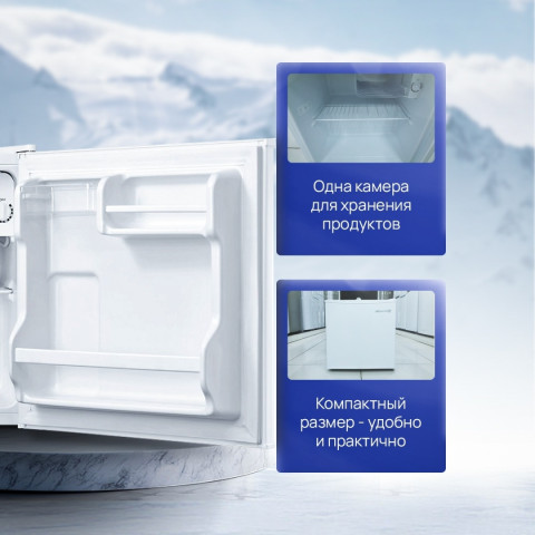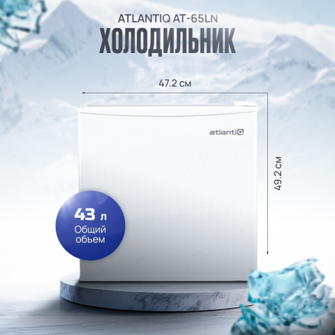 Atlantiq AT-65LN, белый. Холодильник с морозильником, объём 43 л. 1 камера, 1 дверь. Управление механическое. Хладагент R600a. Класс A. Габариты: 472×450×492 мм. Инвертор — нет.