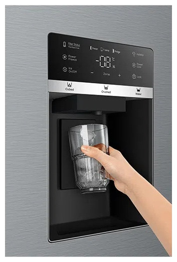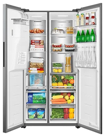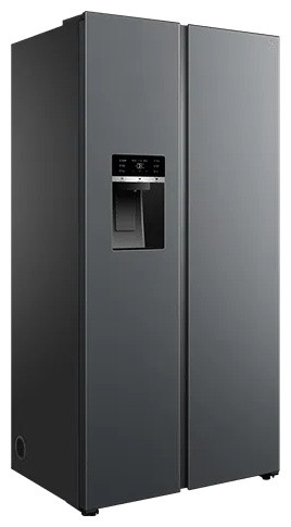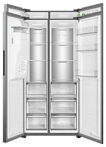 Тип – холодильник с морозильником Side by side, Установка – отдельностоящая, Дверь - 2, Управление – электронное, Размораживание - Total No Frost, Общий объем – 538 л, Объем холодильной камеры – 368 л, Хладагент – R600a, Класс энергопотребления – A+, Ширина – 913 мм, Глубина – 680 мм, Высота – 1850 мм, Вес – 102 кг, Уровень шума – 39 дБ, Климатический класс – SN/N/ST/T, Цвет – серебристый, Страна производитель – Китай, Система ААТ (дезинфекция и поглощение запахов), Функция Swing Flow (умная вентиляция), Диспенсер для воды и льда