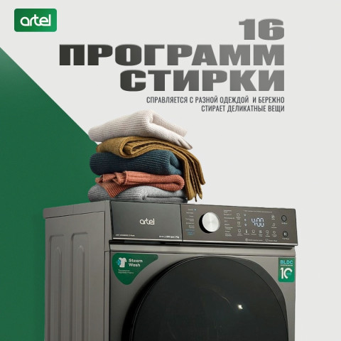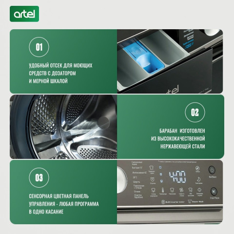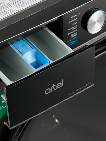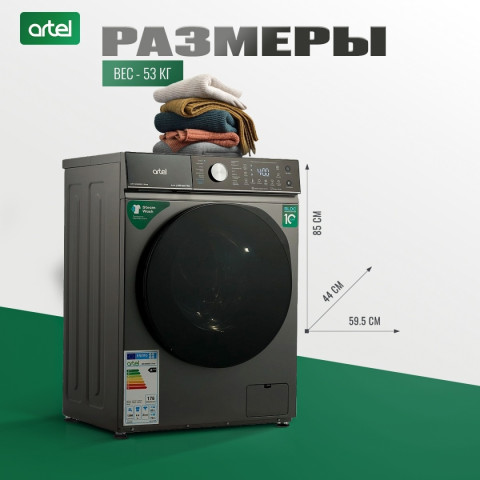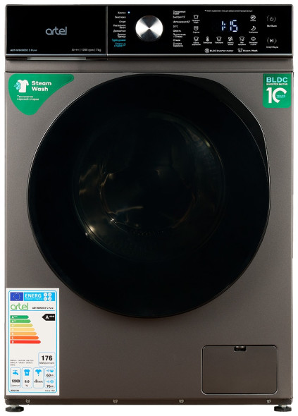 Стиральная машина Artel ART-WM 7002 S Pure. Цвет - серый (серебро). Тип стиральной машины - автомат. Установка - отдельностоящая. Тип загрузки - фронтальная. Инверторный двигатель - Да. Функция паровой стирки - Да. Сенсорное управление - да. Максимальная загрузка белья - 7 кг. Дисплей - есть. Скорость вращения при отжиме - 1200.0 об/мин. Класс потребления электроэнергии - A+++. Класс эффективности стирки - A. Класс эффективности отжима - B. Защита от детей - Да. Уровень шума (стирка / отжим) - 60 / 76 дБ. Отложенный старт - да. Ночная стирка - да. 16 режимов стирки: хлопок, одеяла, интенсивная стирка, быстрый 15, шерсть, очистка бака, эко 40-60, деликатный, стирка с паром, быстрая 42, полоскание+отжим, спорт, уход за ребёнком, смешанная стирка, 20℃, только отжим. Габариты- 85х 59.5х 44 см. Вес - 53 кг. Габариты в упаковке- 88.5х 65.5х 54.5 см. Вес в упаковке - 57 кг. Страна производства - Узбекистан.