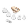 В комплекте к массажёру идут 5 насадок разного размера, а также провод для зарядки. Этого комплекта достаточно, чтобы начать свой путь оздоровления дома с помощью вакуума.